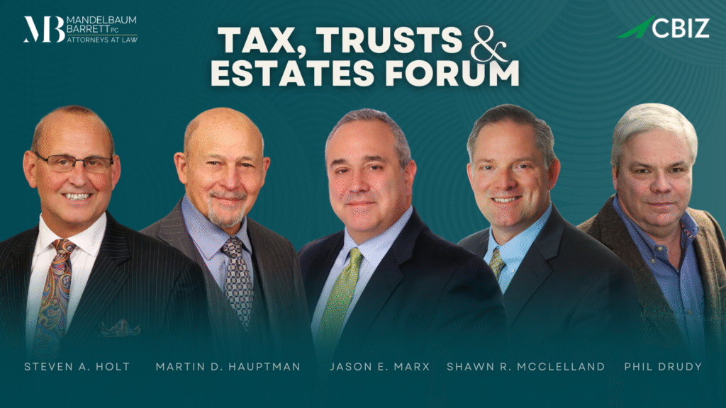 Jason E. Marx is a Partner at Mandelbaum Barrett PC, and a member of the firm’s Tax, Trusts, and Estates Practice Groups. His practice focuses on estate planning, estate administration, elder law, wills and trusts, tax and business planning for individuals, corporations, partnerships and limited liability companies, and tax controversies.