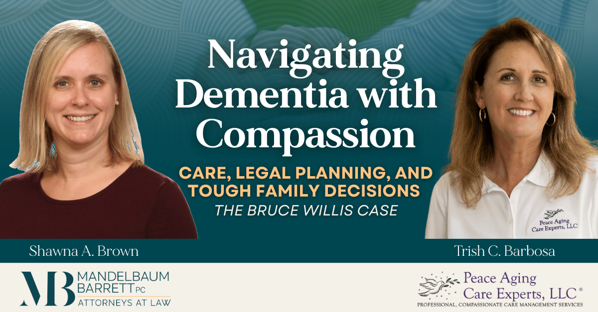 In a recent discussion, Shawna A. Brown, Partner in Mandelbaum Barrett PC’s Elder Law Practice Group, and Trish C. Barbosa, a Certified Geriatric Care Manager and President and Founder of Peace... Read More > -