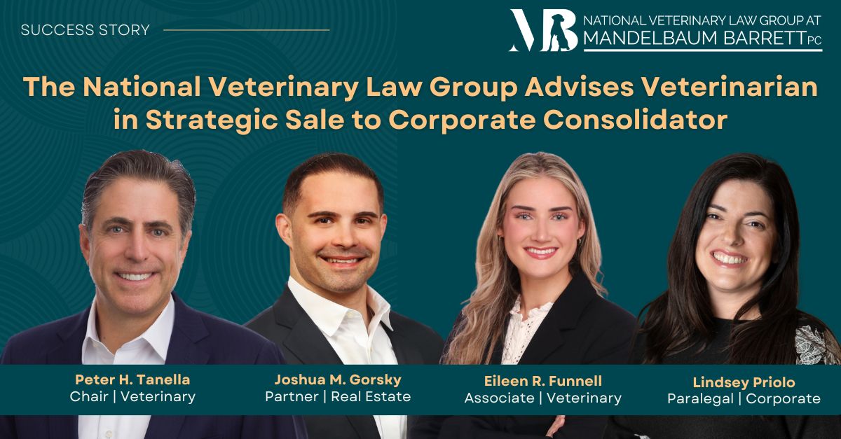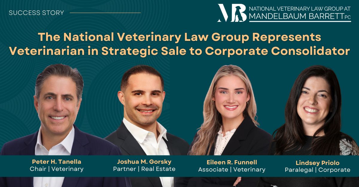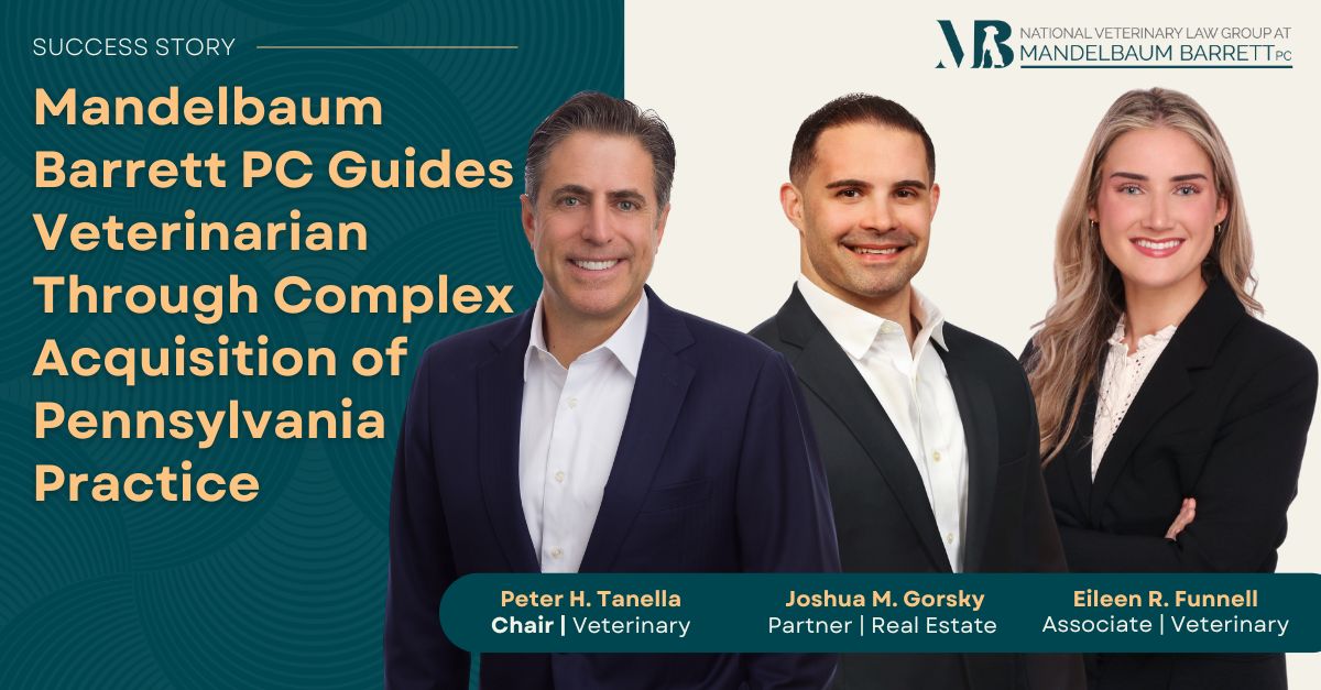 Peter Tanella, Chair of the National Veterinary Law Group, and Joshua Gorsky, Real Estate Partner at Mandelbaum Barrett PC, co-authored an article in the current issue of Today’s Veterinary Business titled “The Art of Real Estate.” They explore the pros and cons of buying vs. leasing for veterinary practices — from building long-term equity to […]