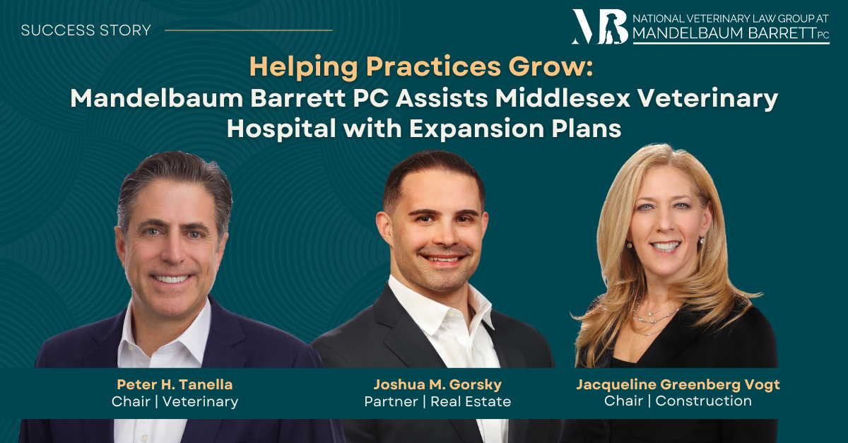 Deal Alert: Attorneys who are part of our National Veterinary Law Group at Mandelbaum Barrett PC recently represented a start-up veterinary hospital client in the acquisition and financing of a building in Monmouth County.